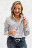 Adorable button down black stripe top with ruffle detail! Great for work and the weekend!