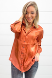 Beautiful light rust button down top with light shimmer! So pretty for work with a blazer, or a night out with denim!