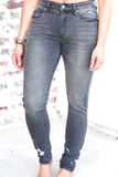 Our new grey wash skinnies are going to be your go to jeans. A tiny bit of distressing gives this pair a little character. Give your outfit an upgraded personality with these pair of super skinny babies. Rise: 9" Inseam: 29"