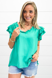 A beathe of summer in our new Del Mar top with ruffle detail in teal! Great for the office, vacation or date night!