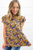 Color pop top with this beaitiful multi floral top on navy background! Tiered bottom, light ruffle detail at neckline. Great summer top for the office, or with shorts and sandals on the weekend and vacation!