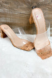 The perfect cork heel with clear strap, will pair great with any color combo! 3" heel.