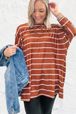 Must have Simple and True Top! Rust and white stripe top is perfect for any occasion, whether you're heading to a casual brunch or out to dinner. The cozy oversized fit is right on trend and super comfortable, making it a versatile piece that you'll reach for time and time!