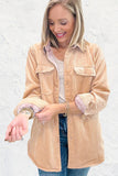 Let's cozy up this season with this reversible camel corduroy shacket with buttons!! Camel on one side, dusty rose plaid on the side (pockets when plaid is outward)