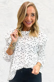 Classis polka dot pattern on this super cute top with ruffle on neckline and ruffle cap sleeve detail. Stretchy and comfortable, easy to style for work or date night!